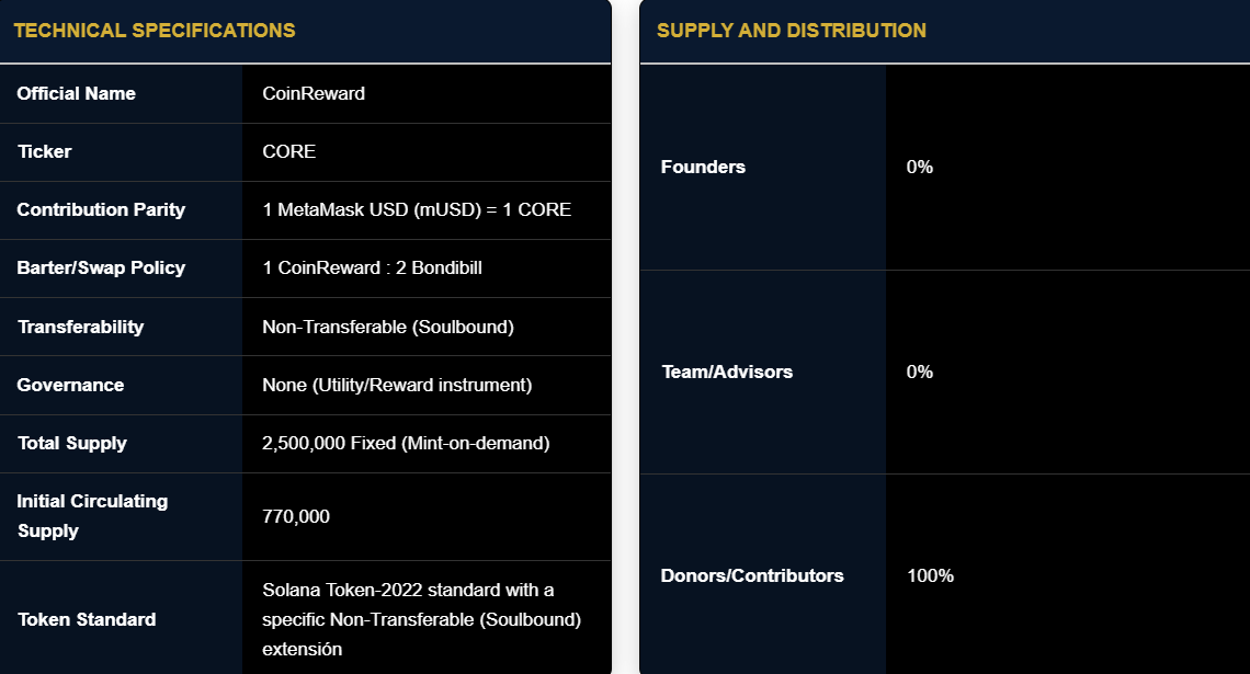 - Barter/Swap Policy: CORE exchanged for Bondibill (BNDB) at a 1CORE : 2BNDB ratio.